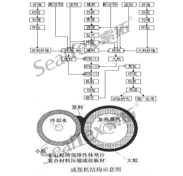 抄取工藝是一種類似造紙工藝的方法,當初是在美國研發成功,用以生產石棉密封材料。美國的阿姆斯壯 Armstrong World Industry于80 年代研發成取代石棉的無石棉密封材料后,便一直使用抄取工藝而成為全球軟墊片材料的供應商。用抄取工藝生產無石棉墊片材料在中國還是個新興工藝。在國內的墊片材料的供應商中,不到 10 家公司能成功生產真正不含石棉的無石棉墊片材料。下圖顯示的是生產無石棉墊片材料使用的抄取法工藝流程: