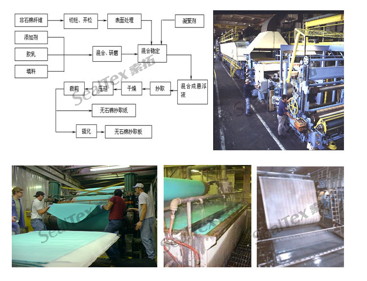 抄取法無石棉密封材料產品的特征:有比較好的均勻度,產品一致性高;產品密度較低,壓縮率高,可以在較低的法蘭壓力與不平整的法蘭面相容整合,達到密封。