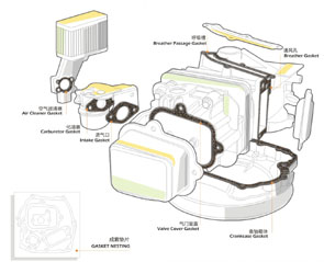 1、空氣濾清器(Air cleaner gasket) 2、化油器(Carburetor gasket) 3、進氣口(Intake gasket) 4、氣門室蓋(Valve cover gasket) 5、通風孔(Breather gasket) 6、呼吸槽(Breather passage gasket) 7、曲軸箱體(Crankcase gasket) |