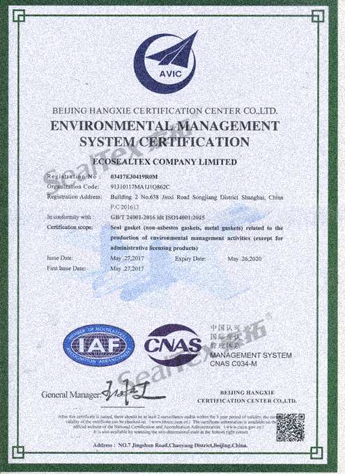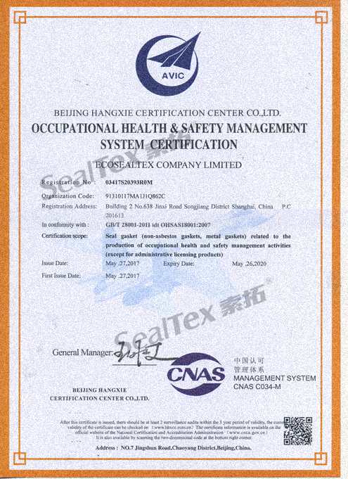 為了更好的推動“禁止使用石棉制品”進程、推進環保事業、樹立企業形象,我司于2017年通過了ISO14001環境管理體系及OHSAS18001職業健康安全管理體系的認證并獲得認證證書。