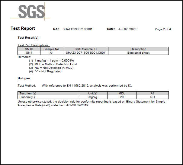 為滿足客戶需求,近日SealTex索拓 ST-2058無石棉板通過了SGS進行的鹵素(氟)檢測,檢測標(biāo)準(zhǔn)EN 14582-2016,報告顯示未測出氟,報告部分截圖如下: