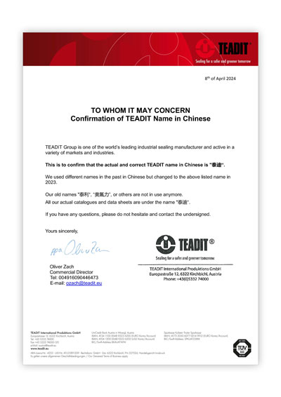 過去使用的中文名稱泰利奧氟力或其他名稱將不再使用,所有TEADIT產品的中文目錄和數據表都將以“TEADIT泰迪”為名。