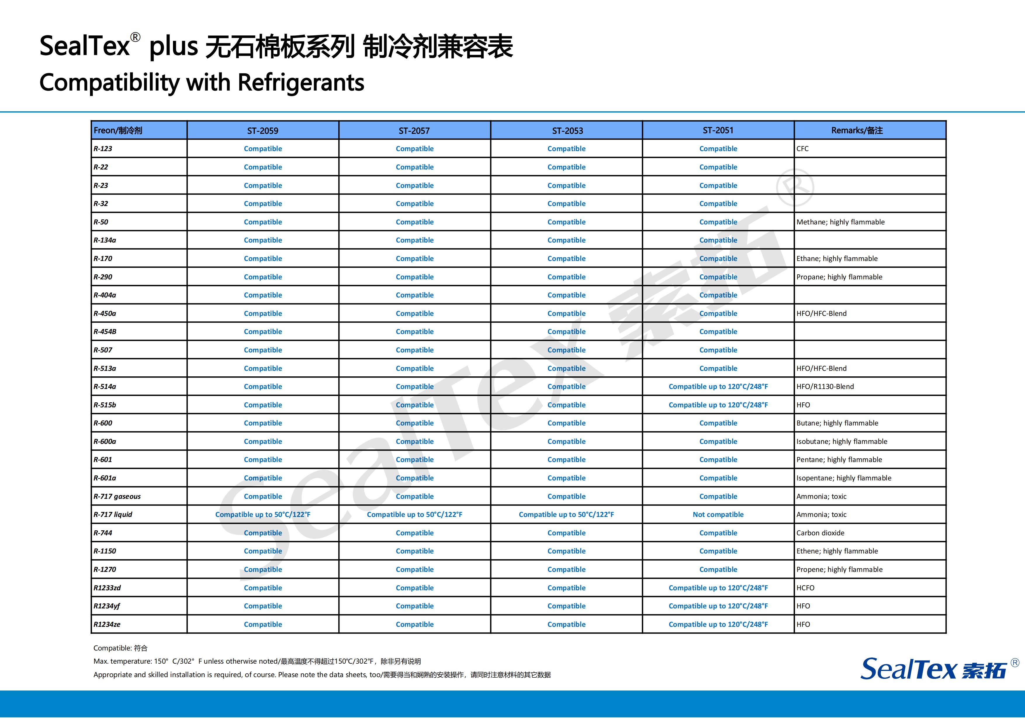 對(duì)于密封式和半密封式制冷壓縮機(jī)來(lái)說(shuō),每類制冷壓縮機(jī)可能會(huì)用到不同的制冷劑,一個(gè)能完全遏止制冷劑的可靠性密封系統(tǒng)是決定壓縮機(jī)長(zhǎng)期穩(wěn)定運(yùn)轉(zhuǎn)的重要因素。SealTex索拓公司為滿足制冷壓縮機(jī)用戶的要求,特別推出能在各種法蘭壓力下保持卓越密封性能的無(wú)石棉密封材料以滿足市場(chǎng)的需求。這些產(chǎn)品非常適用于半密封式壓縮機(jī)、冷卻裝置,對(duì)螺桿式和往復(fù)式壓縮機(jī)的應(yīng)用尤其適合。例如:ST-2059、ST-2057、ST-2053、ST-2051.